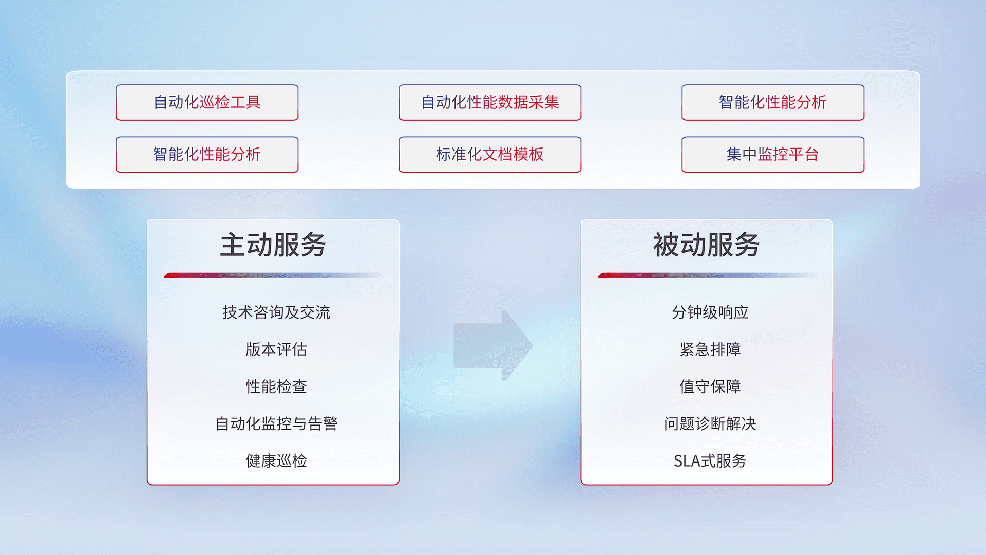 智能化工具和标准化文档,,,保障服务质量,,,提供主动服务(包含技术咨询、、、、版本评估、、、性能检查、、、自动化监控与告警、、健康巡检)和被动服务包含(分钟级响应、、、、紧急排障、、、值守保障、、、、问题诊断解决、、、、SLA服务)。。。。